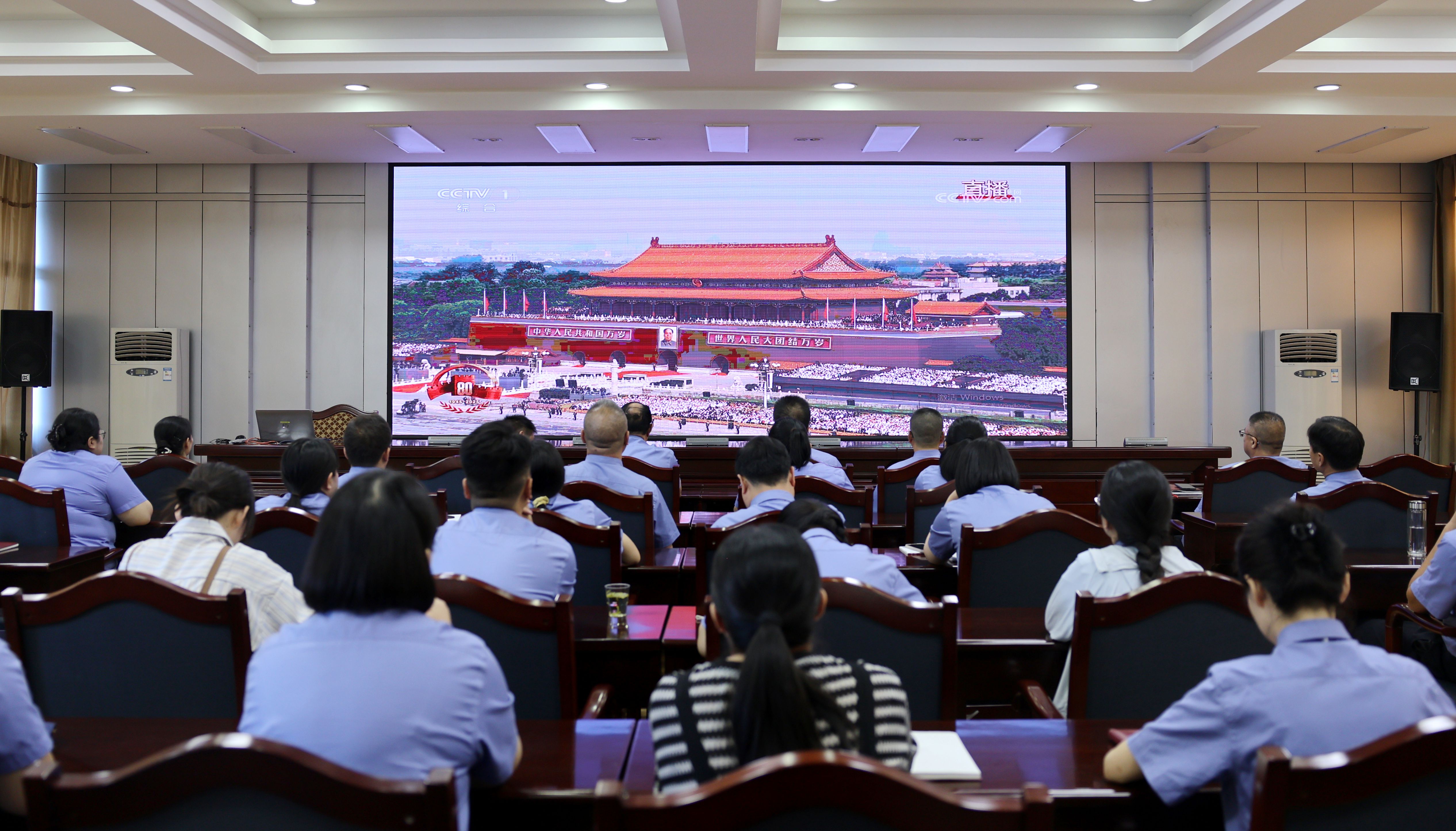上午9时,纪念大会正式开始。全体干警端坐在会议室,神情肃穆,认真聆听习近平总书记发表的重要讲话,深刻领会其精神内涵。随后,盛大恢宏的阅兵场面深深震撼了每一位干警。整齐威武的受阅方队、精良先进的武器装备、气势如虹的空中梯队,充分展现了国家强大的军事实力和综合国力。干警们全程聚精会神、情绪高昂,会议室里掌声阵阵,民族自豪感在每个人心中激荡。